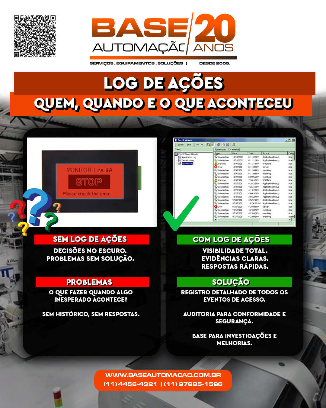 Não basta ter o controle; é preciso registrar e analisar! Com a Base Automação, você tem mais do que equipamentos e soluções, você garante conhecimento para proteger seu negócio e tomar decisões baseadas em dados.